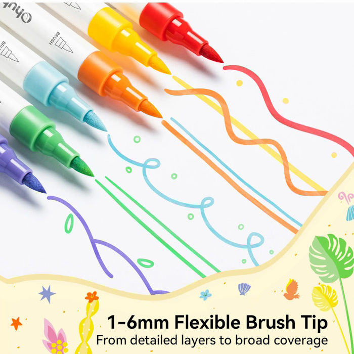Η μαλακή μύτη πινέλου (Brush) επιτρέπει τη δημιουργία γραμμών μεταβλητού πάχους ανάλογα με την πίεση που ασκείται, καθιστώντας τους μαρκαδόρους ιδανικούς για καλλιγραφία, εικονογράφηση και λεπτομερή σκίαση. Το ακρυλικό μελάνι είναι υψηλής ποιότητας, μη τοξικό και άοσμο, ενώ στεγνώνει γρήγορα προσφέροντας ένα μόνιμο αποτέλεσμα που δεν ξεθωριάζει. Η σταθερή παροχή μελανιού εξασφαλίζει ότι κάθε κίνηση του χεριού αποτυπώνεται με καθαρότητα, επιτρέποντας την ομαλή επικάλυψη χρωμάτων για τη δημιουργία βάθους και έντασης στα έργα σας.