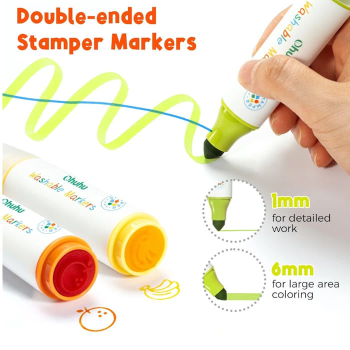 Το μελάνι με βάση το νερό είναι ειδικά σχεδιασμένο για να είναι μη τοξικό και άοσμο, προσφέροντας απόλυτη ασφάλεια κατά τη χρήση σε χαρτί ή μπλοκ ζωγραφικής. Η διπλή λειτουργία κάθε μαρκαδόρου επιτρέπει τη σχεδίαση λεπτών γραμμών με τη μύτη γραφής, ενώ η πίσω πλευρά διαθέτει τη σφραγίδα που προσθέτει έτοιμα σχήματα και μοτίβα στα έργα τέχνης με μία κίνηση. Τα χρώματα είναι λαμπερά και διατηρούν τη ζωντάνια τους, ενώ η ροή του μελανιού είναι σταθερή, αποτρέποντας τη διαρροή και το σκίσιμο του χαρτιού.