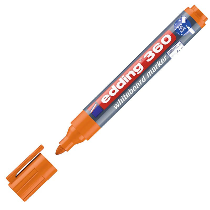 Ο Edding 360 πορτοκαλί είναι ένας κορυφαίας ποιότητας μαρκαδόρος whiteboard που προσφέρει έντονη και καθαρή γραφή με εξαιρετική ορατότητα, ακόμα και από απόσταση. Η στρογγυλή μύτη πάχους 1.5–3mm εξασφαλίζει ομαλή ροή μελανιού και σταθερό πάχος γραμμής, ιδανικό για παρουσιάσεις, μαθήματα και επαγγελματική χρήση. Το στεγνό-σβηστικό, άοσμο μελάνι σβήνεται χωρίς ίχνη και δεν λερώνει τις επιφάνειες.
