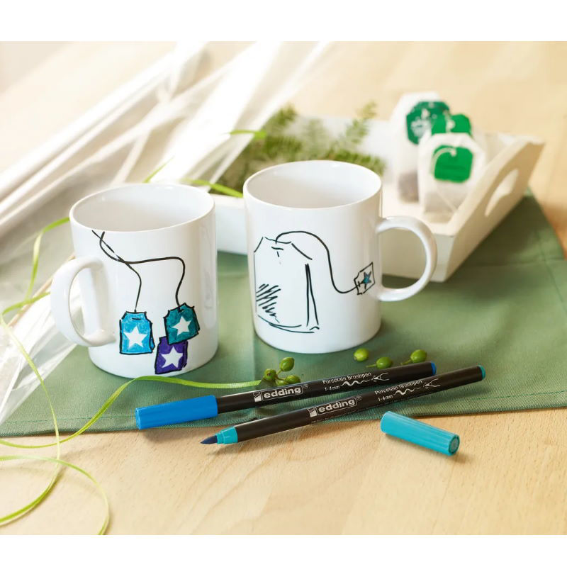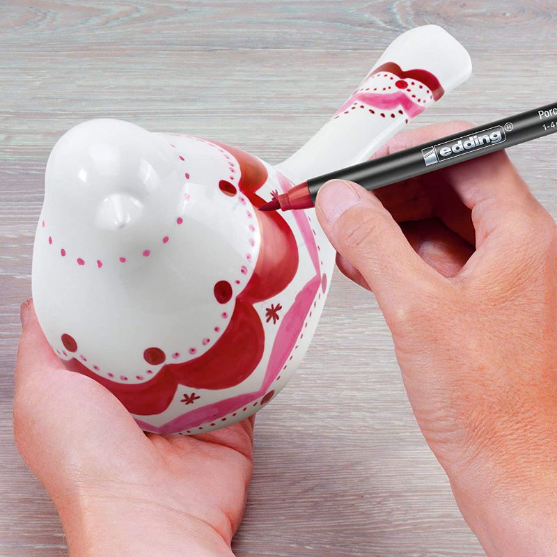 Μαρκαδόρος πορσελάνης Edding κατάλληλοι για στιλβωμένο καραμικό, γυαλί ανθεκτικό στην θερμοκρασία. Πλένεται σε πλυντήριο πιάτων αδού στερεοποιηθεί η βαφή στο φούρνο. Εύκαμπτη μύτη πινέλου για βαφή μεγάλης επιφάνειας, αλλά και μικρών λεπτομερειών. Η μεταξένια υφή που παράγει ομοιόμορφο αποτέλεσμα. Η μελάνη του δεν στάζει και δεν απλώνεται. Σε έντονα χρώματα με βάση το νερό και ουδέτερη μυρωδιά.