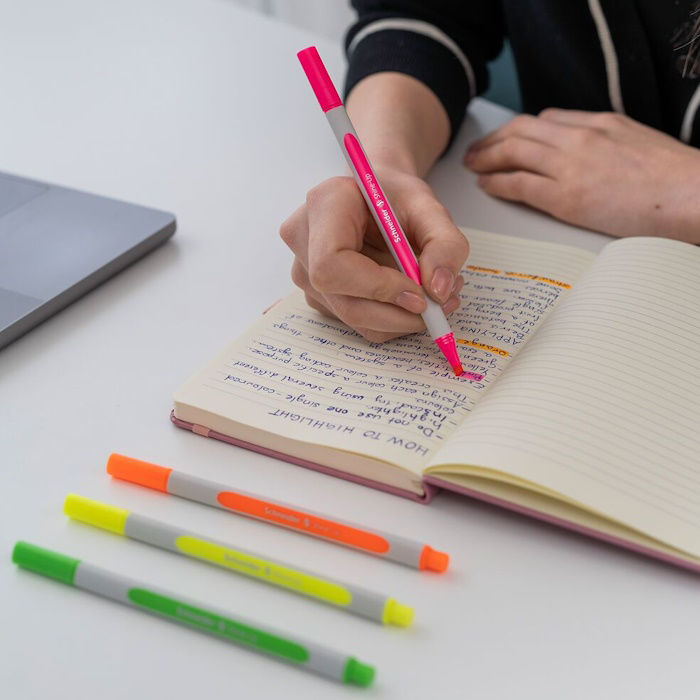 Highlighter Shine-Up σε πλάτη γραμμής 1 + 4 mm. Χρώμα: κίτρινο. Αυτό το highlighter ανήκει σε κάθε μολυβοθήκη ή θήκη για στυλό χάρη στο λεπτό σχήμα του στυλό. Με 4 φωτεινά χρώματα νέον, κάνει το μαρκάρισμα και τη μελέτη πιο διασκεδαστική. Κατασκευασμένο από πάνω από 80% πλαστικό βιολογικής βάσης για την προστασία του περιβάλλοντος και την εξοικονόμηση πόρων. Βραβευμένο με το πιο διάσημο οικολογικό σήμα του κόσμου #Blue Angel#. Χάρη στα δύο πλάτη γραμμών και το λαμπερό γενικό μελάνι για κανονικό χαρτί, χαρτί αντιγραφής και φαξ, το Shine-Up είναι πολύ ευέλικτο. Η εργονομική κάννη με τρεις άκρες μειώνει την κούραση των χεριών.