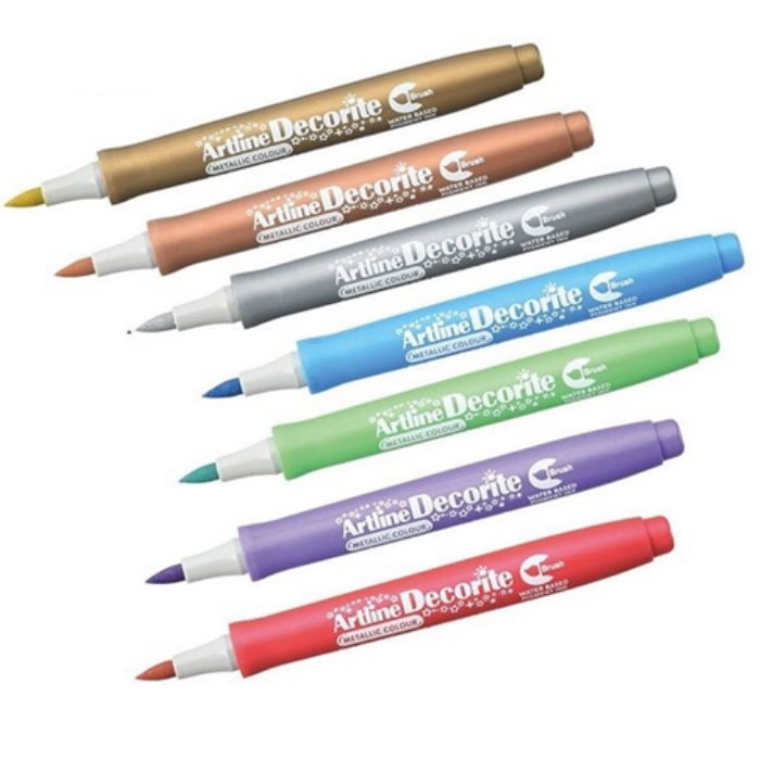 Μαρκαδόρος Decorite με μύτη πινέλο από την Artline. Ο μαρκαδόρος αυτός είναι ιδανικός για εφέ πάνω σε σκούρο χαρτόνι, χαρτί, ξύλο, κεραμικά, πορσελάνη, μέταλλο, πλαστικό, γυαλί και μπορεί εύκολα να αφαιρεθεί από μη πορώδεις επιφάνειες με νερό. Περιέχει μελάνι χρωστικής με βάση το νερό χωρίς ξυλόλιο.