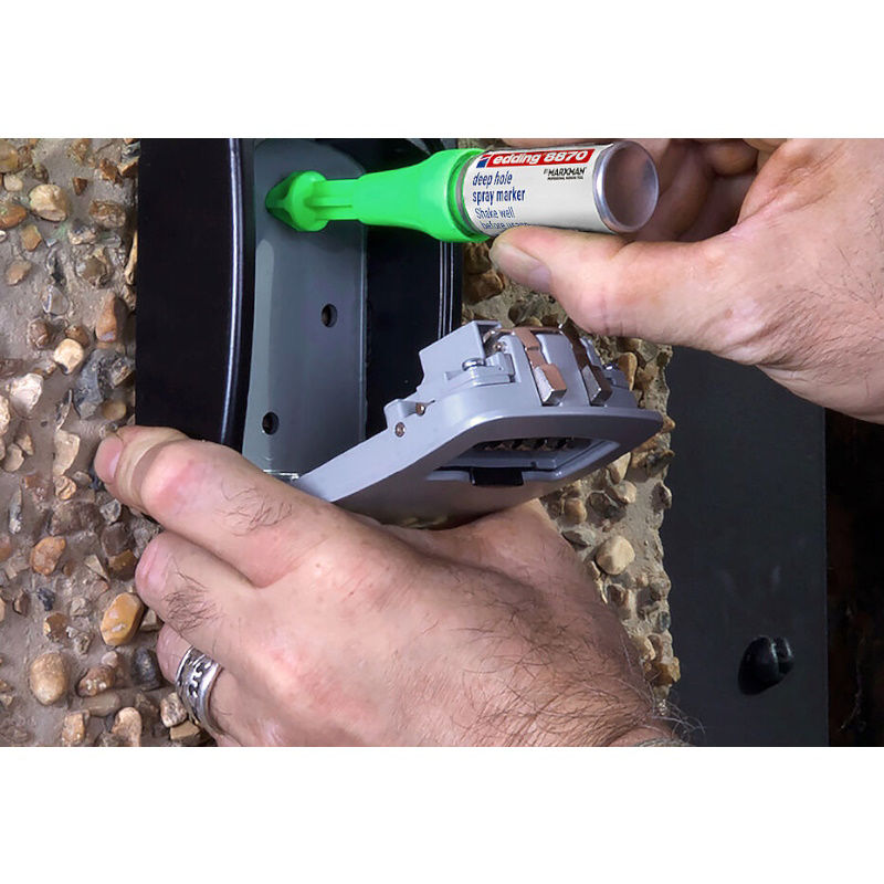 Το ατομικό ακροφύσιο του ψεκασμού κιμωλίας επιτρέπει τη σήμανση μέσω οπών διάτρησης έως 50 mm βάθος και 3-13 mm σε διάμετρο. Μπορεί να χρησιμοποιηθεί από οποιαδήποτε γωνία και ύψος, ακόμη και από πάνω. Η μη μόνιμη κιμωλία σκουπίζεται εύκολα από κλειστές επιφάνειες για γρήγορες διορθώσεις. Διατίθεται σε χρώμα πράσινο νέον.