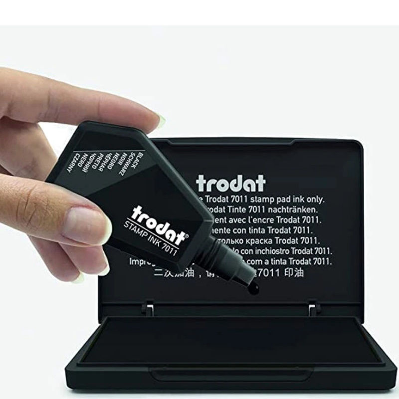 Ελέγξτε για την καλή κατάσταση του ταμπόν σας και το μελάνι της Trodat θα αναζωογονήσει το χρώμα αποτύπωσης της σφραγίδας σας. Η προτεινόμενη ποσότητα εφαρμογής είναι μια σταγόνα μελανιού ανά τετραγωνικό πόντο του ταμπόν σας.