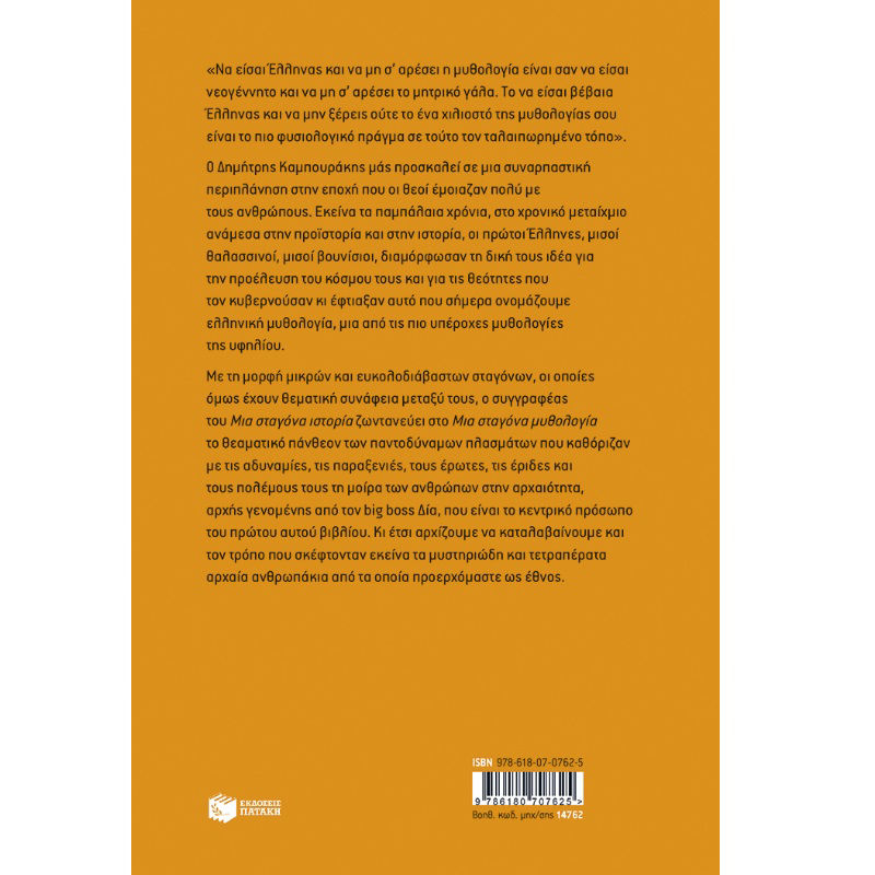 Ο Δηµήτρης Καµπουράκης µάς προσκαλεί σε µια συναρπαστική περιπλάνηση στην εποχή που οι θεοί έµοιαζαν πολύ µε τους ανθρώπους. Εκείνα τα παµπάλαια χρόνια, στο χρονικό µεταίχµιο ανάµεσα στην προϊστορία και στην ιστορία, οι πρώτοι Έλληνες, µισοί θαλασσινοί, µισοί βουνίσιοι, διαµόρφωσαν τη δική τους ιδέα για την προέλευση του κόσµου τους και για τις θεότητες που τον κυβερνούσαν κι έφτιαξαν αυτό που σήµερα ονοµάζουµε ελληνική µυθολογία, µια από τις πιο υπέροχες µυθολογίες της υφηλίου.