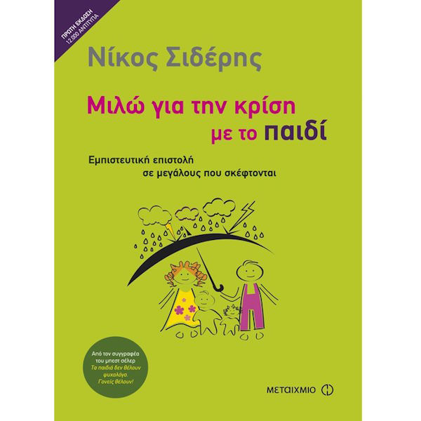 Η κρίση είναι για όλους, μεγάλους και μικρούς, δοκιμασία. Υλική και ψυχική. Ιδιαίτερα μέσα στην καταιγίδα, το παιδί περιμένει από τους μεγάλους να του παράσχουν ασπίδα και χάρτη. Προστασία και προσανατολισμό. Ομπρέλα και λόγια. Να σταθούν πλάι του και να μιλήσουν μαζί του. Ποιος είναι ο σκοπός αυτής της συνομιλίας; Πότε θα μιλήσει ο μεγάλος στο παιδί για την κρίση; Τι θα του πει; Και, το σπουδαιότερο, πώς θα του μιλήσει; Το βιβλίο αυτό προσεγγίζει τέτοια ερωτήματα με τρόπο κατανοητό και άμεσα εφαρμόσιμο στην πράξη. Οι απαντήσεις του βασίζονται σε διεισδυτικές αναλύσεις των ψυχολογικών πτυχών της κρίσης και σε βαθιά γνώση του κόσμου των παιδιών. Παρέχοντας πολύτιμα εργαλεία σε γονείς, δασκάλους, παιδαγωγούς, αλλά και σε κάθε μεγάλο που έχει ζωτική σχέση με το παιδί ή ευθύνη για την εξέλιξή του: ειδικούς ψυχικής υγείας, κοινωνικούς λειτουργούς, διαμορφωτές της κοινής γνώμης, συγγραφείς βιβλίων για παιδιά... Βοηθώντας τους να μιλήσουν με το παιδί κατά τρόπο που προστατεύει τον ψυχικό του κόσμο από τα πλήγματα και τις απειλές και μετουσιώνει τη δοκιμασία σε πολύτιμα μαθήματα ζωής. Ενώ ταυτόχρονα παρέχει σε κάθε σκεπτόμενο πολίτη, τροφή για σκέψη και βαθύτερη κατανόηση των ανθρώπινων πλευρών και των ψυχολογικών μηχανισμών της κρίσης. Συμβάλλοντας στην προσωπική και τη συλλογική αυτογνωσία. Καθώς και στο να μετατραπούν οι εμπειρίες της αντιξοότητας σε πλαίσιο αναβάθμισης για όλους: τα παιδιά, τους μεγάλους, την κοινωνία και τον πολιτισμό μας.
