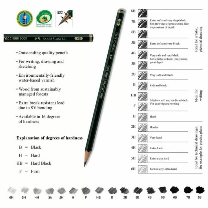 Faber castell 9000 ένα αυθεντικά κλασικό μολύβι - λανσαρίστηκε από τον Κόμη Alexander von Faber-Castell το 1905. Η ποιότητά του και οι προσεκτικά διαβαθμισμένοι βαθμοί σκληρότητας το φέρνουν στην κορυφή των προτιμήσεων καλλιτεχνών και εικονογράφων. Η μύτη του είναι πλήρως συγκολλημένη στο εσωτερικό του ξύλου, γεγονός που το καθιστά ιδιαίτερα ανθεκτικό στο σπάσιμο. Το Castell 9000 διατίθεται σε 16 διαφορετικούς βαθμούς σκληρότητας, καθιστώντας το ιδανικό για κάθε τεχνική και καλλιτεχνική εφαρμογή.