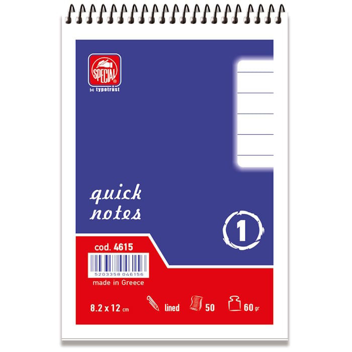Το μπλοκ ριγέ σπιράλ Νο1 Special είναι η ιδανική επιλογή για σημειώσεις, καταγραφές και χρήση στο σχολείο ή στο γραφείο. Με γραμμές (ριγέ διάταξη) για καθαρή και οργανωμένη γραφή και σπιράλ δέσιμο στο επάνω μέρος, προσφέρει πρακτικότητα και άνεση κατά τη χρήση.