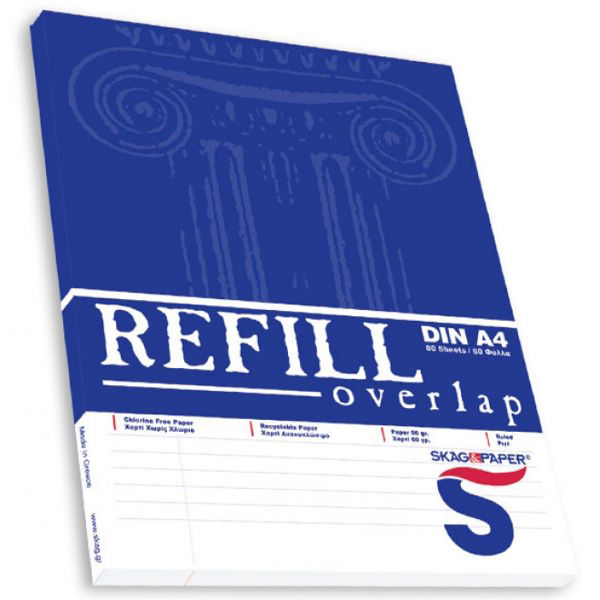 Μπλόκ γραφής Refill Overlap Α4, ριγέ με περιθώριο. Περιέχουν 80 φύλλα και είναι ιδανικά για φοιτητές. Λειτουργικά, με δύο δυνατότητες ανοίγματος, το μπλε με εξώφυλλο που ανοίγει στο πλάι αριστερά Επίσης, κάθε φύλλο μπορεί να αρχειοθετηθεί διότι τα μπλοκ αυτά διαθέτουν 4 τρύπες στην αριστερή πλευρά τους.