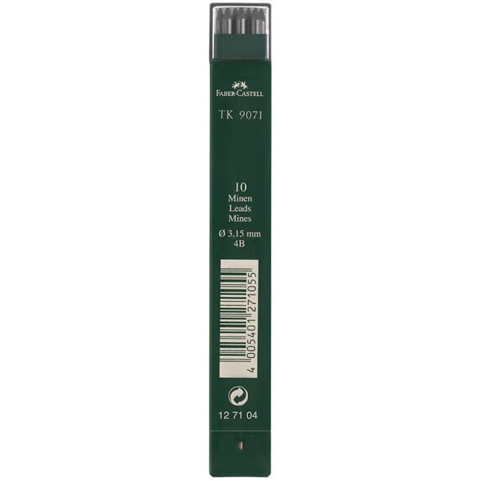 Οι Faber Castell TK 9071 είναι επαγγελματικές μύτες γραφίτη διαμέτρου 3.15mm, ειδικά σχεδιασμένες για μηχανικά μολύβια της σειράς TK Clutch. Ο βαθμός σκληρότητας 4B προσφέρει μαλακή και πλούσια γραμμή, ιδανική για καλλιτεχνικά σκίτσα, σκιές και δημιουργικό σχέδιο με φυσική ροή.