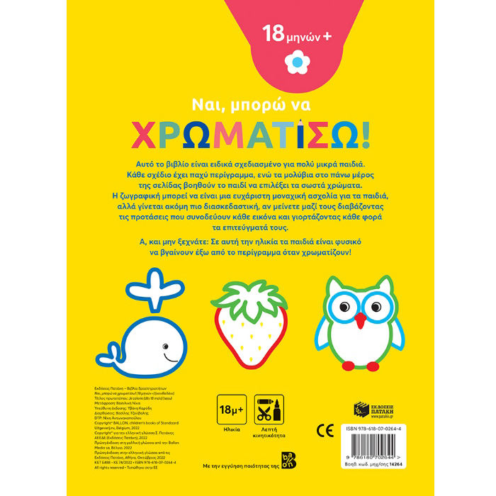 Κάθε σχέδιο έχει παχύ περίγραμμα, ενώ τα μολύβια στο πάνω μέρος της σελίδας βοηθούν το παιδί να επιλέξει τα σωστά χρώματα.