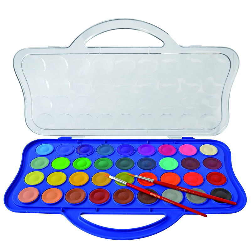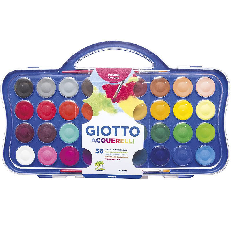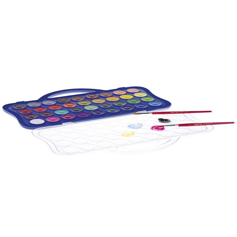 Νερομπογιές Giotto σε συσκευασία σκληρού πλαστικού - παλέτας . Διατίθεται σε συσκευασία με 36 block χρωμάτων των 30mm, τα οποία έρχονται με ένα πινέλο. Άψογο αποτέλεσμα με χρώματα νερού. Οι καλλιτέχνες δεν γεννιούνται, αλλά γίνονται... το μόνο που χρειάζεται είναι λίγο νερό και μερικά χρώματα ακουαρέλας Giotto! Αυτά τα εύκολα στη χρήση μπλοκ χρωμάτων έρχονται σε μια ολόκληρη σειρά από φωτεινά, ζωντανά, αδιαφανή χρώματα ώστε να μπορείτε να δημιουργήσετε το αριστούργημά σας. Αναμίξτε τα χρώματα σαν σεφ που αναμιγνύει τα συστατικά του, για να δημιουργήσει μια αληθινή μαγεία. Και για φανταστικά αποτελέσματα ακουαρέλας, απλά αραιώστε το χρώμα με νερό... είναι το μονο που χρειάζεται!