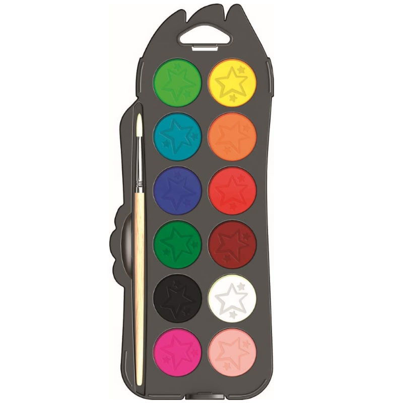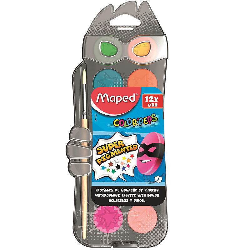 Τα νεροχρώματα Maped με 12 έντονα χρώματα και πινέλο είναι ιδανικά για μικρούς καλλιτέχνες. Η κασετίνα περιλαμβάνει στρογγυλές ταμπλέτες με ζωηρές αποχρώσεις που αναμειγνύονται εύκολα με νερό. Αραιώστε με περισσότερο ή λιγότερο νερό για να πετύχετε διάφανο ή πιο αδιαφανές αποτέλεσμα, ανάλογα με την τεχνική που επιθυμείτε.