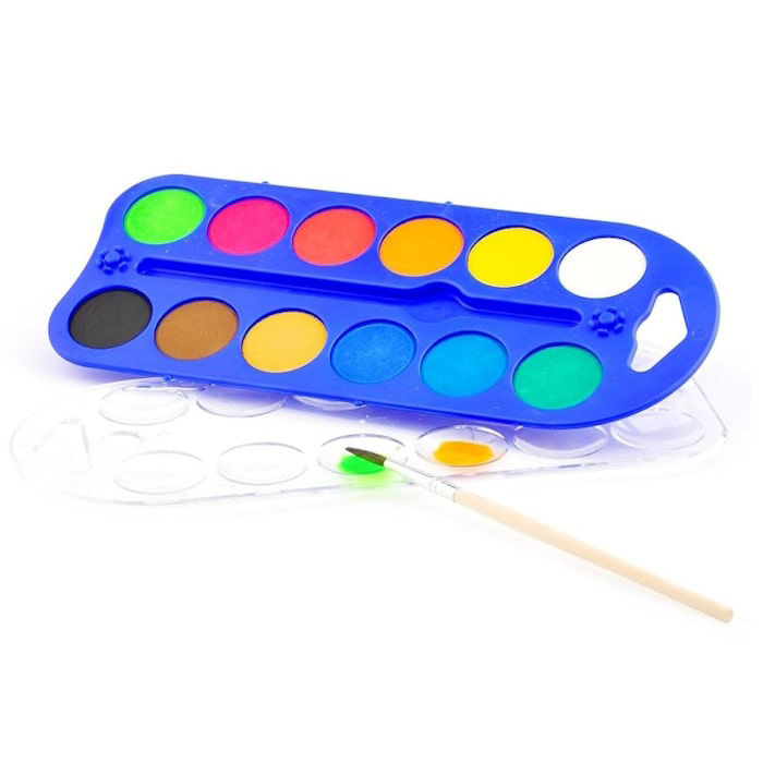 Πλαστικό κουτί με καπάκι που λειτουργεί ως παλέτα, επιτρέπει ανάμειξη του χρώματος, ενώ το πινέλο περιλαμβάνεται στη συσκευασία – μικρό αλλά λειτουργικό, ιδανικό για τα πρώτα βήματα στον κόσμο της ζωγραφικής.