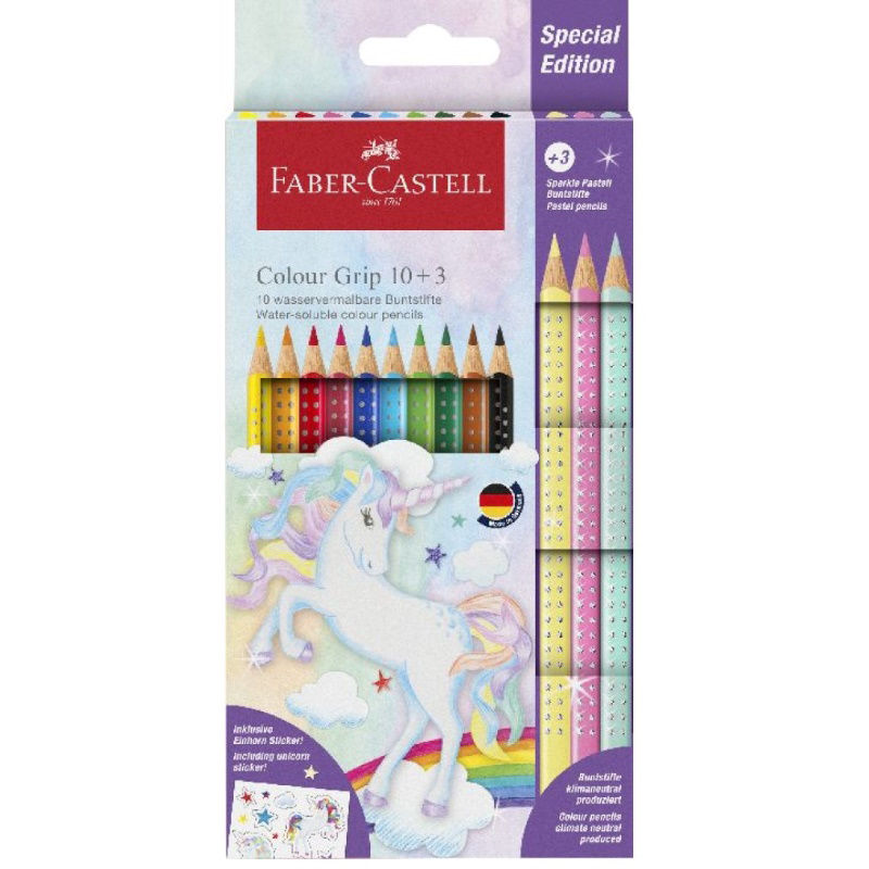 Faber Castell Ξυλομπογιές Grip/Sparkle Μονόκερος 10+3Τμχ. Εργονομικό τριγωνικό σχήμα. Με ανάγλυφη λαβή grip για σταθερό κράτημα .