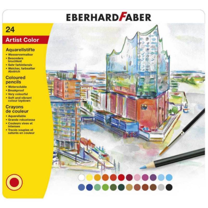 Ξυλομπογιές Aquarella Eberhard Faber Τα εξαγωνικά ξυλοχρώματα ακουαρέλας είναι ιδανικά για το χόμπι και το σχολείο. Με νερό και πινέλο μπορεί να επιτευχθούν αποτελέσματα ακουαρέλας με τα 24 χρώματα που βρίσκονται σε μεταλλική θήκη.