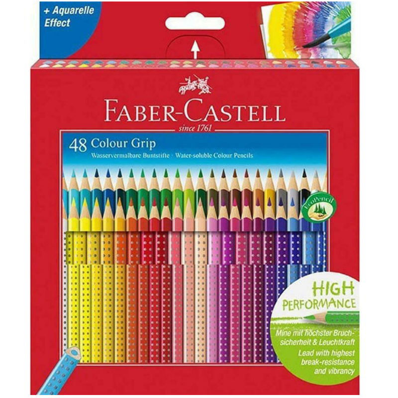 Ξυλομπογές Faber Castell Aquarel Grip 48τεμ. Ιδανικές για τα μεγαλύτερα παιδιά, οι ξυλομπογιές Colour GRIP διαθέτουν εργονομικό τριγωνικό σώμα και την πατενταρισμένη λαβή Soft-Grip, διασφαλίζοντας ξεκούραστη και άνετη ζωγραφική. Τα ιδιαιτέρως ζωντανά χρώματα οφείλονται στην υψηλή περιεκτικότητα της μύτης σε χρωστικές. Οι ιδατοδιαλυτές χρωστικές δίνουν εξαιρετικά αποτελέσματα: απλώς ζωγραφίστε, περάστε τη ζωγραφιά σας με ένα ελαφρώς βρεγμένο πινέλο και φτιάξτε μια όμορφη εικόνα.