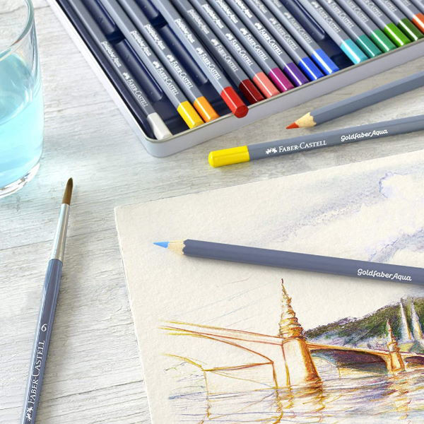 Τα μολύβια Goldpaber Aqua ακουαρέλα πείθουν με τη μαλακή και έντονο χρωματισμό τους, καθώς και με εξαιρετική λάμψη χρώματος τους χρησιμοποιώντας είτε ξηρές, είτε υγρές τεχνικές. Όλες οι τεχνικές ξηρής σχεδίασης των χρωμάτων μπορούν να χρησιμοποιηθούν με αυτά τα μολύβια ακουαρέλας. Χρησιμοποιώντας ένα υγρό πινέλο, οι εκπληκτικές ζωγραφιές ακουαρέλας μπορούν να φτιαχτούν σε ένα μοτίβο ή σχέδιο σχεδιασμένο με το Goldfaber Aqua. Το πλήρως υδατοδιαλυτό μολύβι Goldfaber Aqua waterolour κατασκευάστηκε με την πιο πρωτοποριακή τεχνολογία παραγωγής και εντυπωσιάζει με την εξαιρετική αντοχή του στο φως.