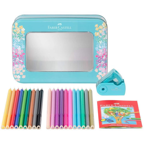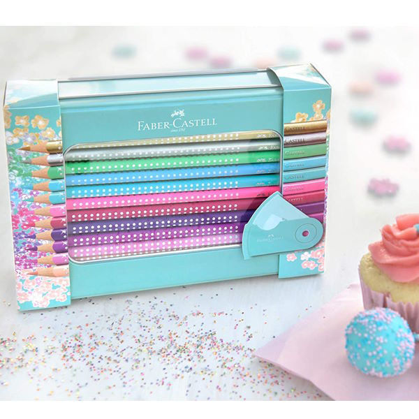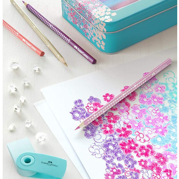 Το σετ Faber-Castell Grip Sparkle 20 τεμαχίων συνδυάζει ζωντανά χρώματα με αστραφτερή εμφάνιση χάρη στις λαμπερές λεπτομέρειες στη λαβή. Κάθε ξυλομπογιά διαθέτει τριγωνικό εργονομικό σχήμα και αντιολισθητικές κουκκίδες Grip, που εξασφαλίζουν σταθερό και ξεκούραστο κράτημα ακόμα και μετά από πολύωρη χρήση. Όλα αυτά σε ένα όμορφο μεταλλικό κουτί με ένα τυρκουάζ καπάκι.