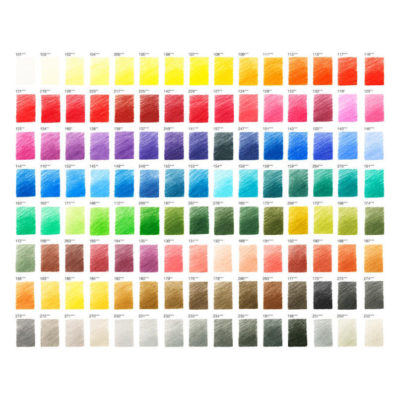 White, Ivory, Cream, Light Yellow Glaze, Cadmium Yellow Lemon, Light Cadmium Yellow, Light Chrome Yellow, Cadmium Yellow, Dark Cadmium Yellow, Dark Chrome Yellow, Cadmium Orange, Orange Glaze, Dark Cadmium Orange, Light Cadmium Red, Scarlet Red, Pale Geranium Lake, Deep Scarlet Red, Deep Red, Middle Cadmium Red, Permanent Carmine. Dark Red, Magenta, Madder, Alizarzin Crimson, Pink Carmine, Rose Carmine, Fuchsia, Middle Purple Pink, Light Purple Pink, Pink Madder Lake, Light Magenta, Ligth Red-Violet, Red-Violet, Crimson, Manganese Violet, Violet, Purple Violet, Blue Violet, Mauve, Delft Blue, Dark Indigo, Indanthrene Blue, Helioblue-Reddish, Cobalt Blue, Ultramarine, Light Ultramarine, Skyblue, Cobalt Blue Gunlich, Phthalo Blue, Middle Phthalo Blue, Light Phthalo Blue, Helio Turquoise, Bluish Turquoise, Prussian Blue, Cobalt Turquoise, Light Cobalt Turquoise, Cobalt Green, Deep Cobalt Green, Hooker’s Green, Dark Phthalo Green. Chrome Oxide Green Fiery, Phthalo Green, Emerald Green, Ohthalogrun Hell, Light Green, Grass Green, Leaf Green, Permanent Green, Permanent Green Olive, Pine Green, Chrome Oxid Green, Juniper Green, Olive Green Yellowish, May Green, Earth Green Yellowish, Chromium Green Opaque, Earth Green, Caput Mortuum, Indian Red, Caput Mortuum Violet, Burnt Carmine, Dark Flesh. Medium Flesh, Light Flesh, Cinnamon, Pompeian Red, Venetian Red, Sanguine, Burnt Ochre, Terracotta, Light Yellow Ochre, Naples Yellow, Dark Naples Ochre, Green Gold, Brown Ochre, Raw Umber, Bistre, Van Dyck Brown, Nougat, Burnt Umber, Burnt Siena, Walnut Brown, Dark Sepia, Warm Grey Vi, Warm Grey V, Warm Grey Iii, Warm Grey Ii, Warm Grey I, Cold Grey I, Cold Grey Ii, Cold Grey Iii, Cold Grey Iv, Cold Grey V, Cold Grey Vi, Payne’s Grey, Black, Silver, Gold, Copper