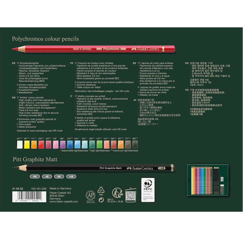 Το σετ περιλαμβάνει 17 χρωματιστά μολύβια Polychromos, 4 μολύβια Pitt Graphite Matt, γόμα και ξύστρα. Η σειρά κραγιόν Polychromos εκτιμάται παγκοσμίως από επαγγελματίες για την απαράμιλλη ποιότητα και τα εξαιρετικά αποτελέσματά της. Έχουν εξαιρετική περιεκτικότητα σε χρωστικές ουσίες, ενθουσιάζοντας με καθαρά και έντονα χρώματα. Κατάλληλα τόσο για γραφιστική σχεδίαση, ελεύθερο και χαλαρό αυτοσχεδιασμό, όσο και για ακριβές ρεαλιστικό σχέδιο. Οι υψηλής ποιότητας χρωστικές χωρίς οξέα είναι ανθεκτικές στο φως, αδιάβροχες και ανθεκτικές στις μουτζούρες. Πολύ μαλακά και απαλά στην εφαρμογή. Τα μολύβια Pitt Graphite Matt είναι μια επανάσταση στο σχέδιο και το σκίτσο. Εξαιρετικά ματ γραφίτης για μειωμένη αντανάκλαση στο χαρτί. Ανώτερη τονική αξία για μέγιστο εφέ βάθους. Μαλακή και ομαλή εφαρμογή. Ιδανικό για γράψιμο, σχεδίαση και σκίτσο.