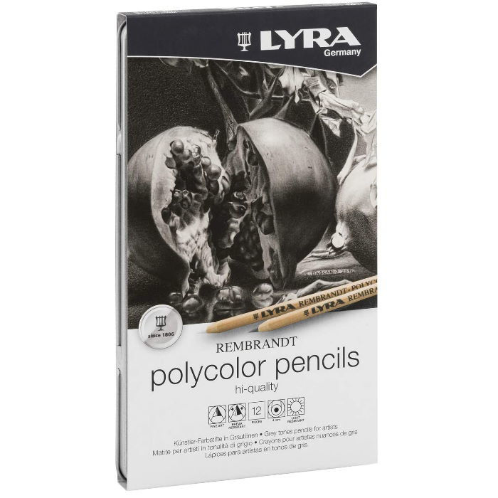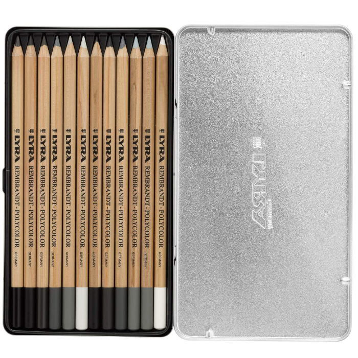 Ξυλομπογίες Polycolor grey Lyra σε μεταλλική κασετίνα. Η κασετίνα περιλαμβάνει 12 ξυλομπογιές σε αποχρώσεις του γκρι, με διάμετρο: 4 mm και μύτη ανθεκτική στο σπάσιμο.