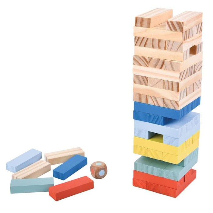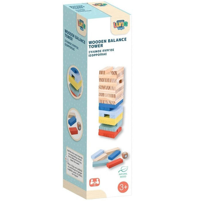 Πύργος Ισορροπίας Ξύλινος Luna Toys με 57 Τουβλάκια, ιδανικό διασκεδαστικό και εκπαιδευτικό παιχνίδι που ενισχύει τις δεξιότητες συγκέντρωσης, υπομονής και συνεργασίας. Περιλαμβάνει 57 ξύλινα τουβλάκια, τα οποία οι παίκτες καλούνται να στοιβάξουν προσεκτικά ώστε να σχηματίσουν έναν πύργο. Το παιχνίδι απαιτεί λεπτές κινήσεις και στρατηγική, καθώς κάθε παίκτης αφαιρεί ένα τουβλάκι χωρίς να ρίξει τον πύργο. Είναι κατάλληλο για όλες τις ηλικίες. Κατασκευασμένο από φυσικό ξύλο, το παιχνίδι προσφέρει αντοχή και μια οικολογική προσέγγιση στη διασκέδαση.