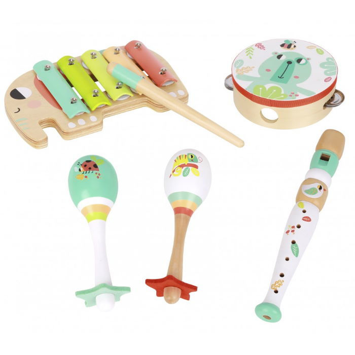 Το σετ αποτελείται από ένα ντέφι, δύο μαράκες, μία φλογέρα κι ένα μεταλλόφωνο που είναι ζωγραφισμένα με όμορφα και ζωηρά χρώματα που κεντρίζουν το βλέμμα του παιδιού και καλλιεργούν την οπτική αντίληψή του.