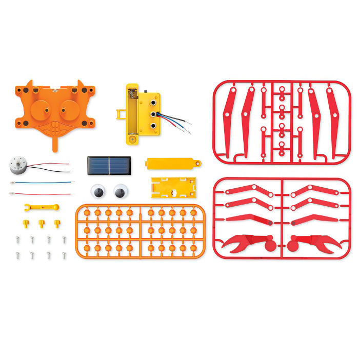 ΠΕΡΙΕΧΟΜΕΝΑ: Τμήμα A: Σώμα ρομπότ, Τμήμα Β: Κάλυμμα μοτέρ, Τμήμα Γ: Θήκη μπαταρίας, Τμήμα Δ: Τμήμα συγκράτησης ηλιακού πάνελ, Τμήμα Ε: Ηλιακό πάνελ, Τμήμα ΣΤ: Κάλυμμα μπαταρίας, Τμήμα Ζ: Μοτέρ, Τμήμα H: Δεξί πόδι x 2, Τμήμα Θ: Μεγάλη σύνδεση x 4, Τμήμα Ι: Κοντή σύνδεση x 4, Τμήμα K: Αριστερό πόδι x 2, Τμήμα Λ: Αριστερή δαγκάνα, Τμήμα M: Δεξιά δαγκάνα, Τμήμα Ν: Αριστερή σύνδεση x 2, Τμήμα Ξ: Δεξιά σύνδεση x 2, Τμήμα Ο: Αριστερό οπίσθιο πόδι, Τμήμα Π: Δεξιό οπίσθιο πόδι, Τμήμα Ρ: συνδέσμους στερέωσης x 30, Τμήμα Σ: Κινούμενο μάτι x 2, Τμήμα T: Ζεύγη καλωδίων, Τμήμα Υ: Βραχίονας στήριξης, Τμήμα Φ: Βίδα x 4, και Τμήμα Χ: Καπάκια ακροδέκτη x 3.