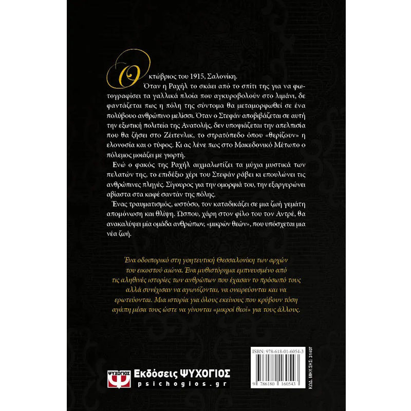 Ένα οδοιπορικό στη γοητευτική Θεσσαλονίκη των αρχών του εικοστού αιώνα. Ένα μυθιστόρημα εμπνευσμένο από τις αληθινές ιστορίες των ανθρώπων που έχασαν το πρόσωπό τους αλλά συνέχισαν να αγωνίζονται, να ονειρεύονται και να ερωτεύονται. Μια ιστορία για όλους εκείνους που κρύβουν τόση αγάπη μέσα τους ώστε να γίνονται «μικροί θεοί» για τους άλλους.
