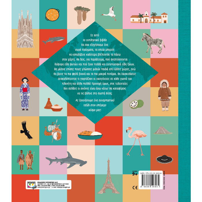 Σε αυτό το εκπληκτικό βιβλίο θα σου εξηγήσουμε ένα σωρό πράγματα, τα οποία μπορείς να καταλάβεις καλύτερα βλέποντάς τα πάνω στον χάρτη. Θα δεις, για παράδειγμα, πού αναπτύσσονται διάφορα είδη φυτών και πού ζουν πολλά και εντυπωσιακά είδη ζώων. Θα μάθεις επίσης ποιες γλώσσες μιλούν παιδιά από άλλες χώρες, ενώ θα βρεις τα πιο ψηλά βουνά και τα πιο μακριά ποτάμια. Θα διασκεδάσεις ανακαλύπτοντας τι γιορτάζουν οι οικογένειες σε κάθε γωνιά του πλανήτη και άλλα πολλά! Προσοχή όμως, στις τελευταίες δύο σελίδες οι εικόνες είναι άνω κάτω! Θα καταφέρεις να τις βάλεις στη σωστή θέση;