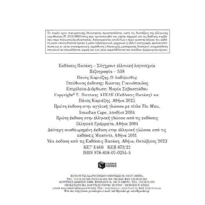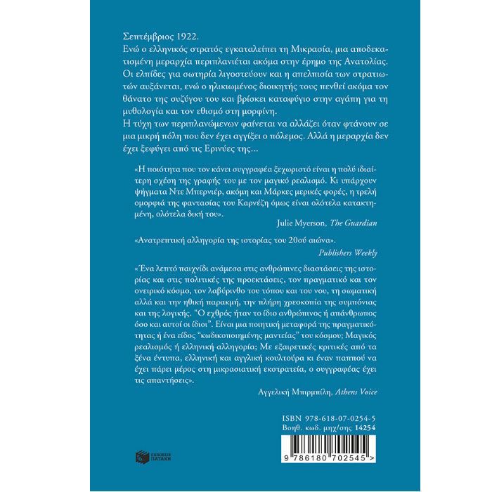 Σεπτέµβριος 1922. Ενώ ο ελληνικός στρατός εγκαταλείπει τη Μικρασία, µια αποδεκατισµένη µεραρχία περιπλανιέται ακόµα στην έρηµο της Ανατολίας. Οι ελπίδες για σωτηρία λιγοστεύουν και η απελπισία των στρατιωτών αυξάνεται, ενώ ο ηλικιωµένος διοικητής τους πενθεί ακόµα τον θάνατο της συζύγου του και βρίσκει καταφύγιο στην αγάπη για τη µυθολογία και τον εθισµό στη µορφίνη. Η τύχη των περιπλανώµενων φαίνεται να αλλάζει όταν φτάνουν σε µια µικρή πόλη που δεν έχει αγγίξει ο πόλεµος. Αλλά η µεραρχία δεν έχει ξεφύγει από τις Ερινύες της... «Η ποιότητα που τον κάνει συγγραφέα ξεχωριστό είναι η πολύ ιδιαί-τερη σχέση της γραφής του µε τον µαγικό ρεαλισµό. Κι υπάρχουν ψήγµατα Ντε Μπερνιέρ, ακόµη και Μάρκες µερικές φορές, η τρελή οµορφιά της φαντασίας του Καρνέζη όµως είναι ολότελα κατακτηµένη, ολότελα δική του». Julie Myerson, The Guardian «Ανατρεπτική αλληγορία της ιστορίας του 20ού αιώνα». Publishers Weekly «Ένα λεπτό παιχνίδι ανάµεσα στις ανθρώπινες διαστάσεις της ιστορίας και στις πολιτικές της προεκτάσεις, τον πραγµατικό και τον ονειρικό κόσµο, τον λαβύρινθο του τόπου και του νου, τη σωµατική αλλά και την ηθική παρακµή, την πλήρη χρεοκοπία της συµπόνιας και της λογικής. “O εχθρός ήταν το ίδιο ανθρώπινος ή απάνθρωπος όσο και αυτοί οι ίδιοι”. Eίναι µια ποιητική µεταφορά της πραγµατικότητας ή ένα είδος “κωδικοποιηµένης µαντείας” του κόσµου; Mαγικός ρεαλισµός ή ελληνική αλληγορία; Mε εξαιρετικές κριτικές από τα ξένα έντυπα, ελληνική και αγγλική κουλτούρα κι έναν παππού να έχει πάρει µέρος στη µικρασιατική εκστρατεία, ο συγγραφέας έχει τις απαντήσεις». Αγγελική Μπιρµπίλη, Athens Voice