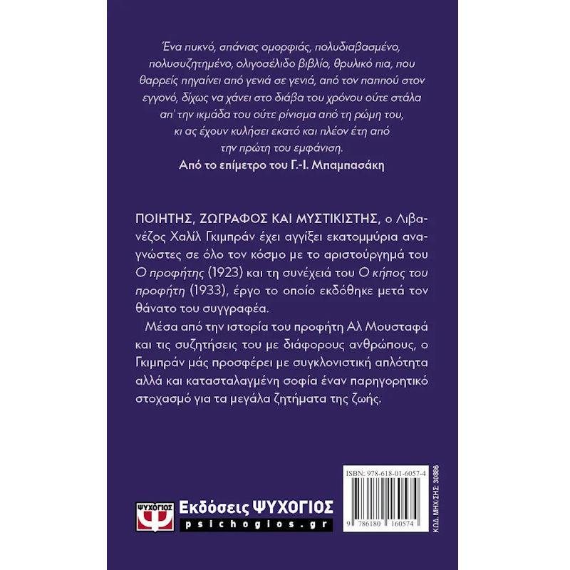 Ποιητής, ζωγράφος και μυστικιστής, ο Λιβανέζος Χαλίλ Γκιμπράν έχει αγγίξει εκατομμύρια αναγνώστες σε όλο τον κόσμο με το αριστούργημά του Ο προφήτης (1923) και τη συνέχειά του Ο κήπος του προφήτη (1933), έργο το οποίο εκδόθηκε μετά τον θάνατο του συγγραφέα.