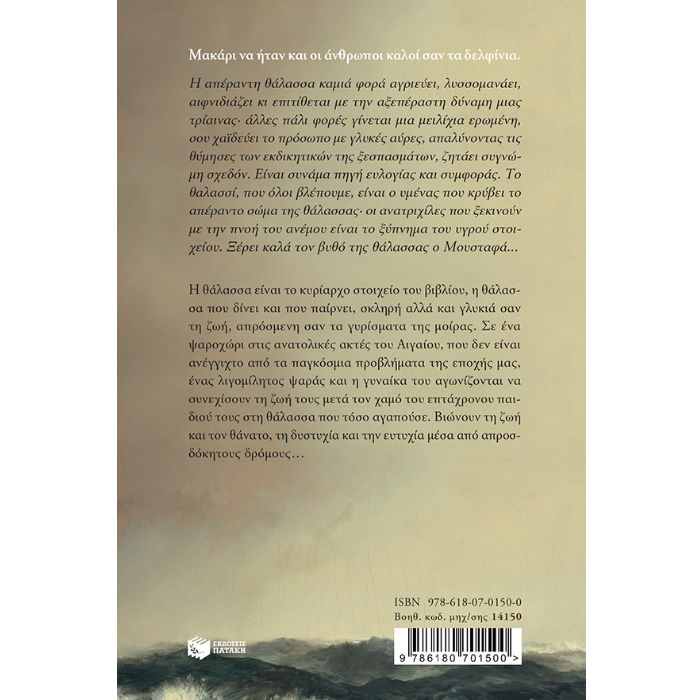 Η απέραντη θάλασσα καµιά φορά αγριεύει, λυσσοµανάει, αιφνιδιάζει κι επιτίθεται µε την αξεπέραστη δύναµη µιας τρίαινας? άλλες πάλι φορές γίνεται µια µειλίχια ερωµένη, σου χαϊδεύει το πρόσωπο µε γλυκές αύρες, απαλύνοντας τις θύµησες των εκδικητικών της ξεσπασµάτων, ζητάει συγνώµη σχεδόν. Είναι συνάµα πηγή ευλογίας και συµφοράς. Το θαλασσί, που όλοι βλέπουµε, είναι ο υµένας που κρύβει το απέραντο σώµα της θάλασσας? οι ανατριχίλες που ξεκινούν µε την πνοή του ανέµου είναι το ξύπνηµα του υγρού στοιχείου. Ξέρει καλά τον βυθό της θάλασσας ο Μουσταφά...
