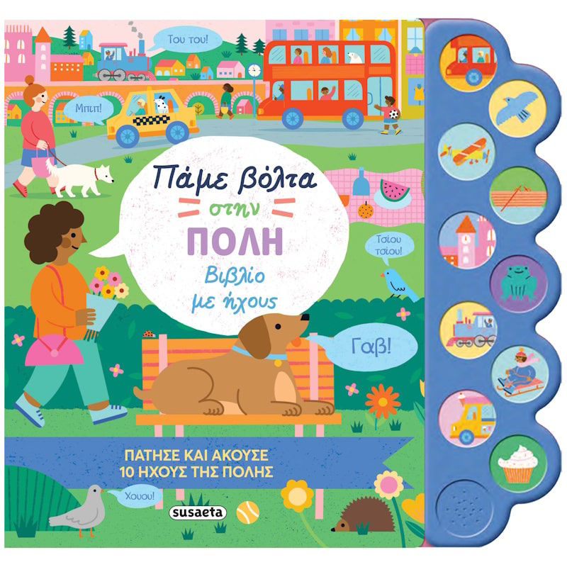Μπες στο λεωφορείο και γύρισε όλη την πόλη παρέα με αυτό το απίθανο βιβλίο με ήχους! Από τον κεντρικό σταθμό και το καταπράσινο πάρκο μέχρι τα χιονισμένα βουνά και την αμμουδερή παραλία, το βιβλίο αυτό θα σε ταξιδέψει από τη μια άκρη της πόλης ως την άλλη! Πάτησε τα πολύχρωμα κουμπιά και άκουσε 10 υπέροχους ήχους!