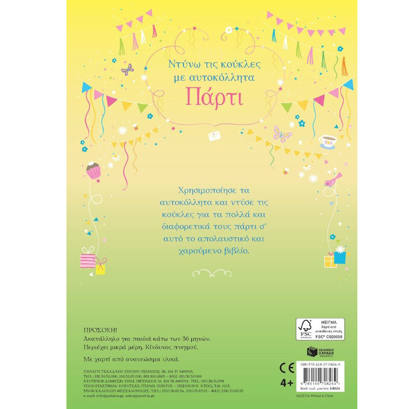 Χρησιμοποίησε τα αυτοκόλλητα και ντύσε τις κούκλες για τα πολλά και διαφορετικά τους πάρτι σ’ αυτό το απολαυστικό και χαρούμενο βιβλίο.