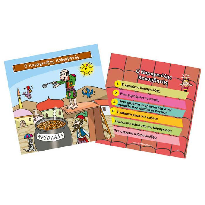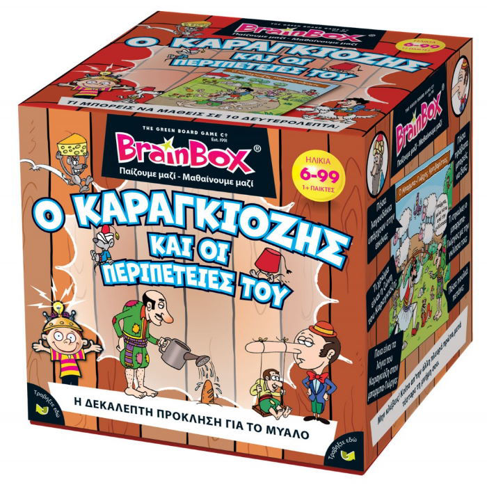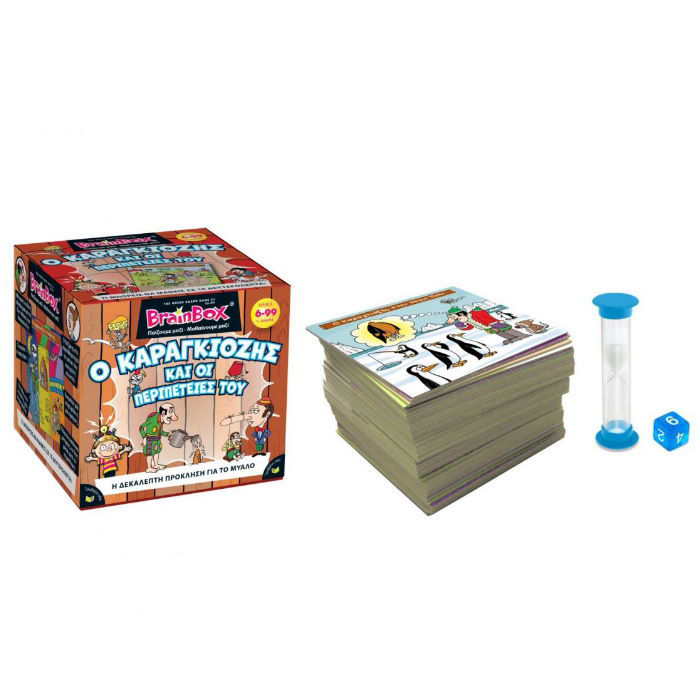 Αυτό το συναρπαστικό BrainBox με κεντρικό ήρωα τον διαχρονικό, λαϊκό και ασυμβίβαστο Καραγκιόζη, παρουσιάζει στιγμές από τις καθημερινές ξεκαρδιστικές περιπέτειες που περνά αλλά και προκαλεί και στους υπόλοιπους ήρωες του Θεάτρου Σκιών. Με χαρακτηριστικά το αστείρευτο και πρωτότυπο χιούμορ και τη σατιρική διάθεση που διακρίνει τον αγαπημένο καμπούρη της λαϊκής μας παράδοσης Καραγκιόζη θέλει να μας περάσει το μήνυμα ότι το χιούμορ είναι απαραίτητο στοιχείο στη ζωή για να διατηρούμε την αισιοδοξία μας στις περιπέτειες που μπορεί να τύχουν σε όλους μας. Σχεδιασμένο για να παίζουν οι γονείς με τα παιδιά τους, αυτό το υπέροχο παιχνίδι θα βοηθήσει στη βελτίωση της παρατηρητικότητας και των μνημονικών ικανοτήτων. Σκοπός του παιχνιδιού: Μάζεψε τις περισσότερες κάρτες μέσα σε 10 λεπτά.