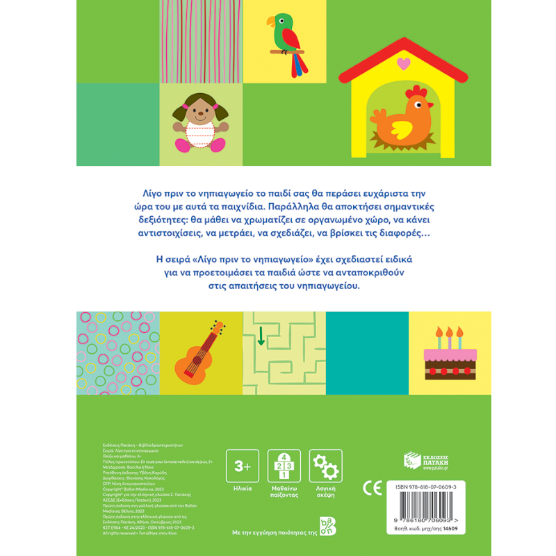 Λίγο πριν το νηπιαγωγείο το παιδί σας θα περάσει ευχάριστα την ώρα του με αυτά τα παιχνίδια. Παράλληλα θα αποκτήσει σημαντικές δεξιότητες: θα μάθει να χρωματίζει σε οργανωμένο χώρο, να κάνει αντιστοιχίσεις, να μετράει, να σχεδιάζει, να βρίσκει τις διαφορές…