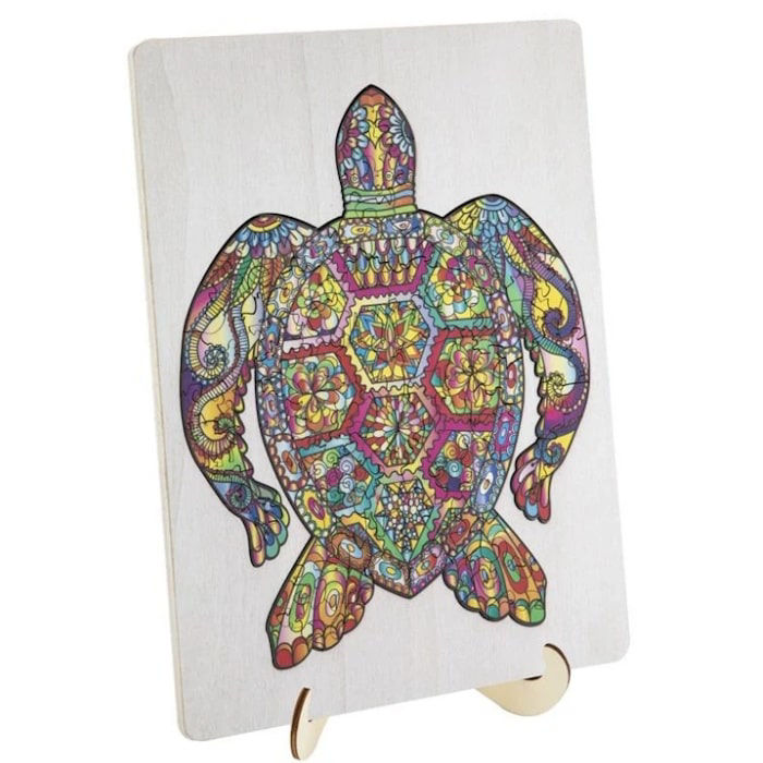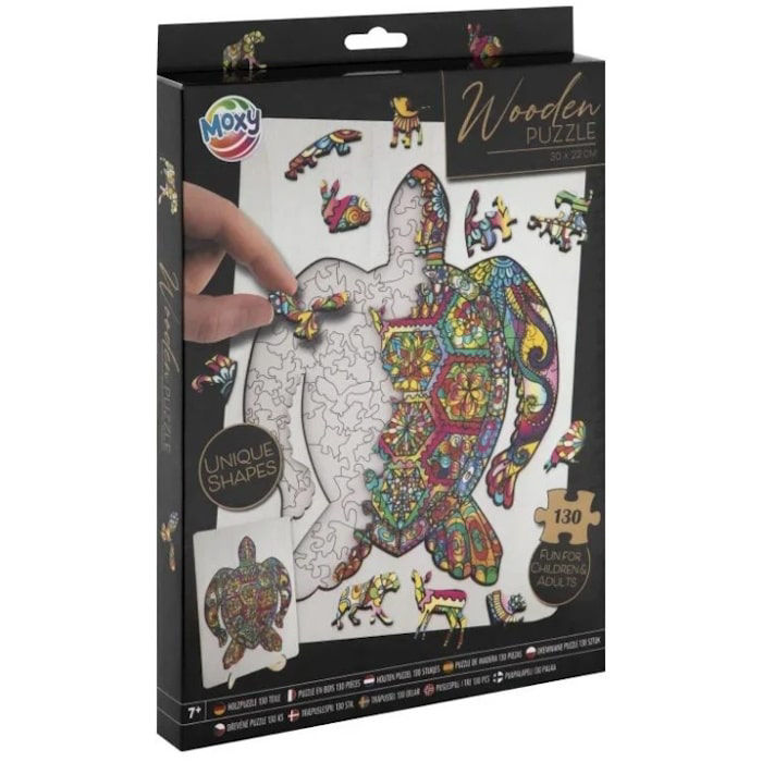 Ανακάλυψε την ομορφιά του βυθού με το Ξύλινο Παζλ Moxy Χελώνα! Με 130 λεπτοδουλεμένα ξύλινα κομμάτια, αυτό το παζλ αποτυπώνει τη χάρη και τη γαλήνη μιας θαλάσσιας χελώνας σε ζωηρά χρώματα. Οι διαστάσεις 30x22cm το καθιστούν ιδανικό για να το κορνιζάρεις μετά την ολοκλήρωση. Κατάλληλο τόσο για παιδιά όσο και για ενήλικες, είναι μια δραστηριότητα που συνδυάζει ψυχαγωγία και χαλάρωση μέσα από ένα έργο τέχνης εμπνευσμένο από τη φύση.
