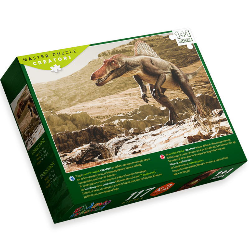 Με το περιεχόμενο του κουτιού μπορείτε να συνθέσετε δύο εικόνες δεινοσαύρων: του Αλλόσαυρου και του Σπινόσαυρου. Κάθε εικόνα αποτελείται από 117 κομμάτια παζλ.