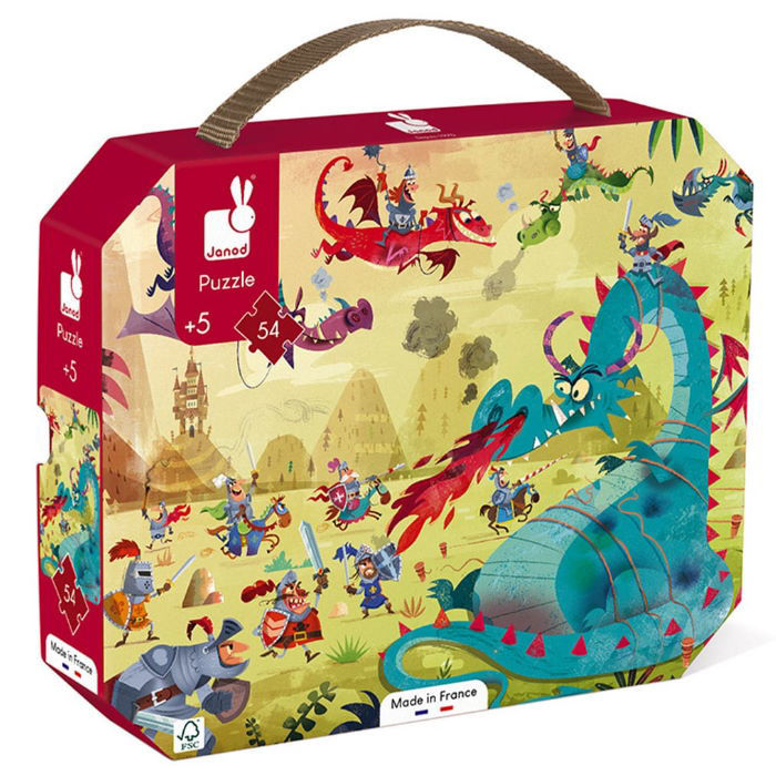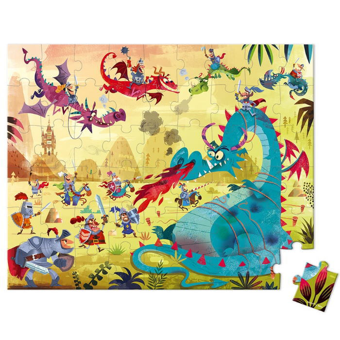 Βοηθήστε τους ιππότες να πολεμήσουν... ΔΡΑΚΟΥΣ! Τα παιδιά άνω των 5 ετών θα γοητευτούν από αυτές τις υπέροχες ζωγραφιές. Το παζλ έχει διαστάσεις 50 x 40 cm όταν ολοκληρωθεί. Στην όμορφη μικρή του θήκη, το παζλ θα είναι εύκολο στη μεταφορά χάρη στην υφασμάτινη λαβή του. Περιέχει αφίσα που χρησιμεύει ως πρότυπο.
