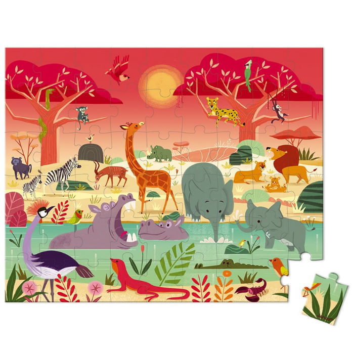Ήρθε η ώρα για τα παιδιά να ξεκινήσουν ένα σαφάρι, καθώς ο ήλιος δύει στις αφρικανικές πεδιάδες! Αυτό το υπέροχο παζλ από χαρτόνι 54 τεμαχίων με πολλές λεπτομέρειες και ζεστούς τόνους υπόσχεται μια μαγική περιπέτεια. Η ήρεμη σαβάνα και τα εικονιζόμενα ζώα είναι μια πρόσκληση για απόδραση! Αυτό το παζλ θα βοηθήσει στην ανάπτυξη της μνήμης και των δεξιοτήτων παιδιών ηλικίας 5 ετών και άνω. Το παζλ μπορεί να μεταφερθεί εύκολα παντού, χάρη στο φοβερό κουτί σε σχήμα βαλίτσας και την υφασμάτινη λαβή. Περιλαμβάνει μια αφίσα που χρησιμεύει ως πρότυπο.