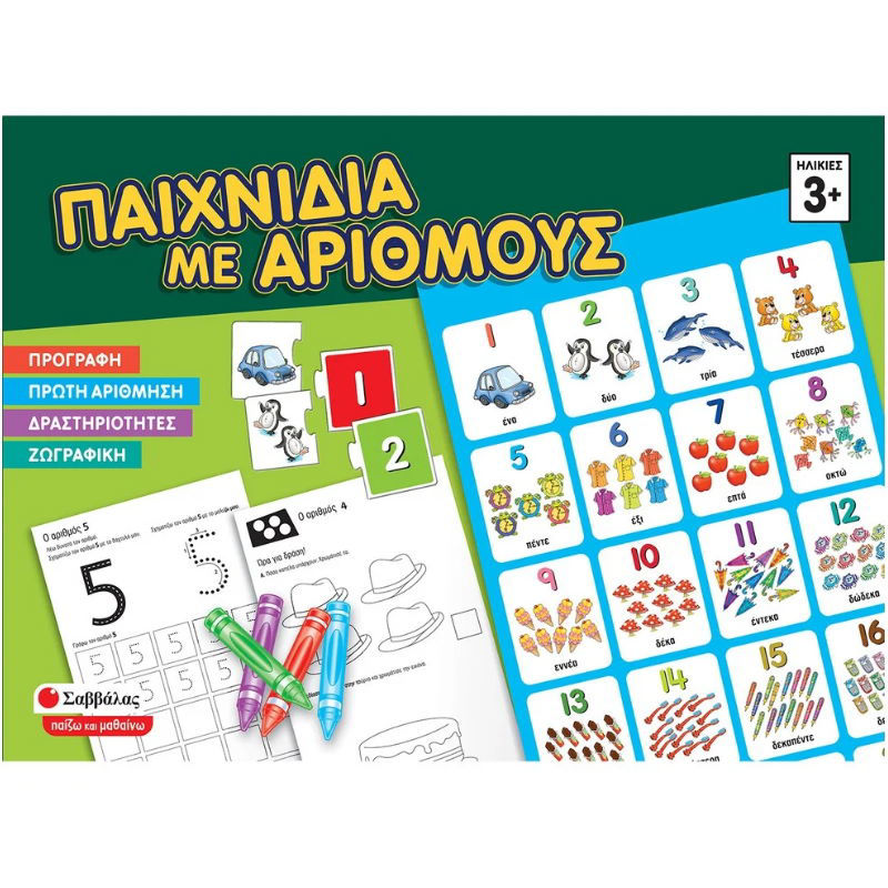 Ένα πλήρες πακέτο με καρτέλες, αφίσες, κηρομπογιές και μολύβι για ατέλειωτες ώρες δημιουργικής απασχόλησης με ζωγραφική και δραστηριότητες προγραφής και πρώτης αρίθμησης.