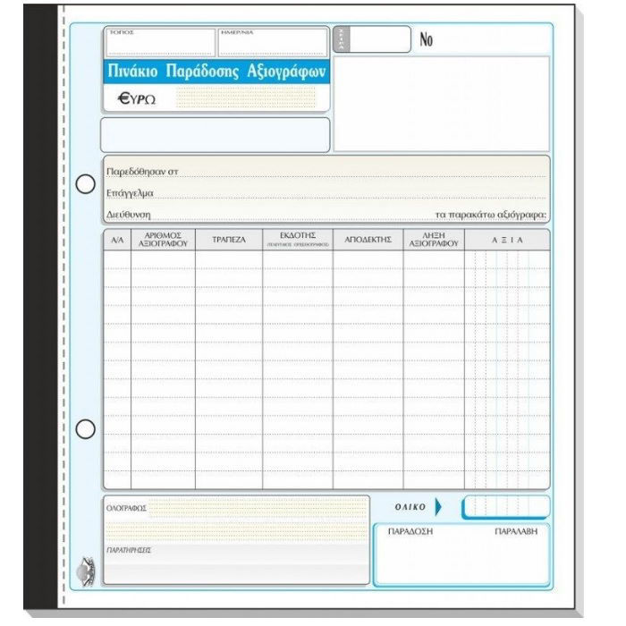 Λογιστικό έντυπο με στήλες για αναλυτικές πληροφορίες για τη παράδοση αξιογράφων