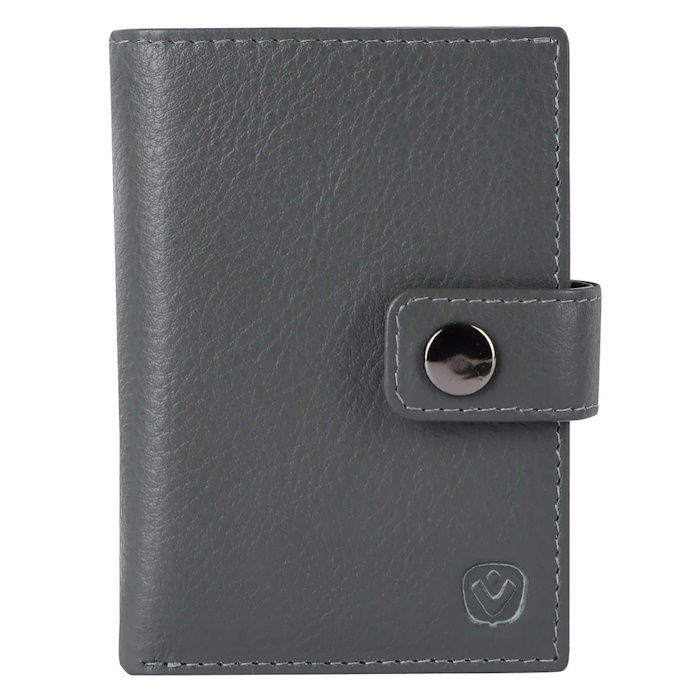 Ανακαλύψτε το γκρι δερμάτινο κάλυμμα πορτοφολιού MagSafe από τη Valenta με προστασία RFID, που συνδυάζεται με το αλουμίνιο Cardprotector της Valenta.