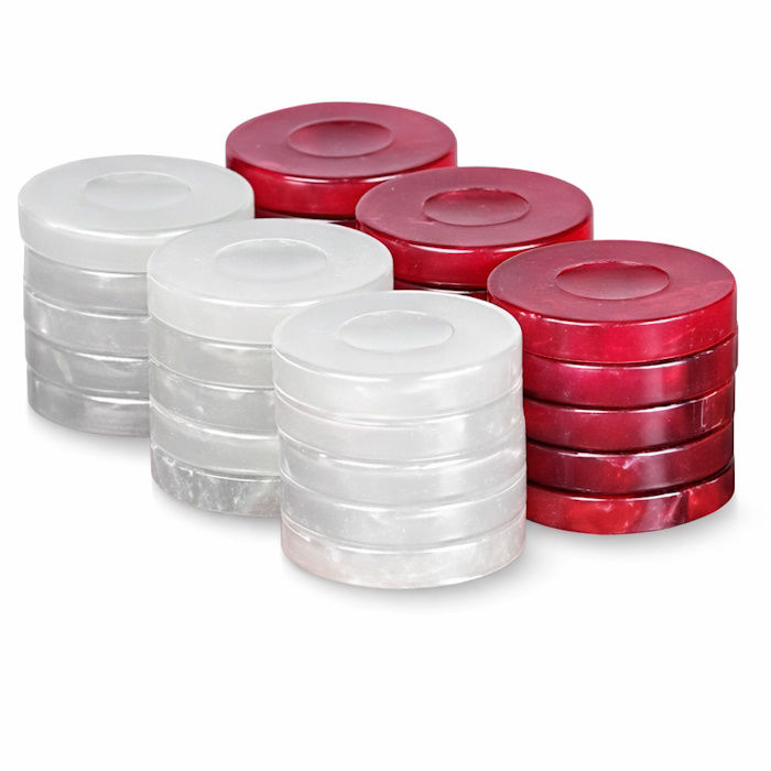 Το σετ αποτελείται από 30 τεμάχια, χωρισμένα σε δύο αποχρώσεις για τους δύο παίκτες. Είναι κατασκευασμένα από υψηλής ποιότητας ακρυλικό υλικό, το οποίο εξασφαλίζει ότι δεν θα γρατζουνιστούν εύκολα και θα διατηρήσουν τη λάμψη τους ακόμα και μετά από πολλές ρίξεις. Το βάρος και η υφή τους είναι προσεγμένα ώστε να γλιστρούν σωστά στο ταμπλό και να παράγουν τον χαρακτηριστικό, ικανοποιητικό ήχο του παιχνιδιού. Διατίθενται σε διάφορους χρωματικούς συνδυασμούς για να επιλέξετε αυτόν που ταιριάζει καλύτερα στο δικό σας στυλ και στο χρώμα του ταμπλόη