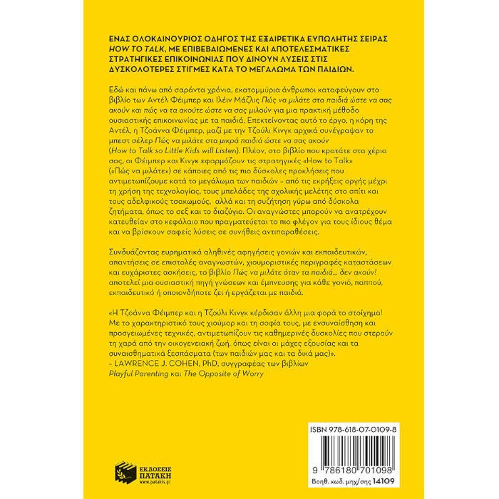 Εδώ και πάνω από σαράντα χρόνια, εκατομμύρια άνθρωποι καταφεύγουν στο βιβλίο των Αντέλ Φέιμπερ και Ιλέιν Μάζλις Πώς να μιλάτε στα παιδιά ώστε να σας ακούν και πώς να τα ακούτε ώστε να σας μιλούν για μια πρακτική μέθοδο ουσιαστικής επικοινωνίας με τα παιδιά. Επεκτείνοντας αυτό το έργο, η κόρη της Αντέλ, η Τζοάννα Φέιμπερ, μαζί με την Τζούλι Κινγκ αρχικά συνέγραψαν το μπεστ σέλερ Πώς να μιλάτε στα μικρά παιδιά ώστε να σας ακούν (How To Talk So Little Kids Will Listen). Πλέον, στο βιβλίο που κρατάτε στα χέρια σας, οι Φέιμπερ και Κινγκ εφαρμόζουν τις στρατηγικές «How To Talk» («Πώς να μιλάτε») σε κάποιες από τις πιο δύσκολες προκλήσεις που αντιμετωπίζουμε κατά το μεγάλωμα των παιδιών – από τις εκρήξεις οργής μέχρι τη χρήση της τεχνολογίας, τους μπελάδες της σχολικής μελέτης στο σπίτι και τους αδελφικούς τσακωμούς,  αλλά και τη συζήτηση γύρω από δύσκολα ζητήματα, όπως το σεξ και το διαζύγιο. Οι αναγνώστες μπορούν να ανατρέχουν κατευθείαν στο κεφάλαιο που πραγματεύεται το πιο φλέγον για τους ίδιους θέμα και να βρίσκουν σαφείς λύσεις σε συνήθεις αντιπαραθέσεις.