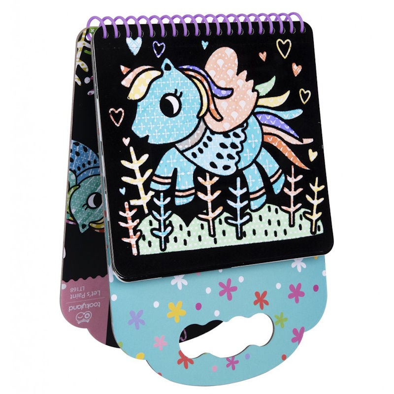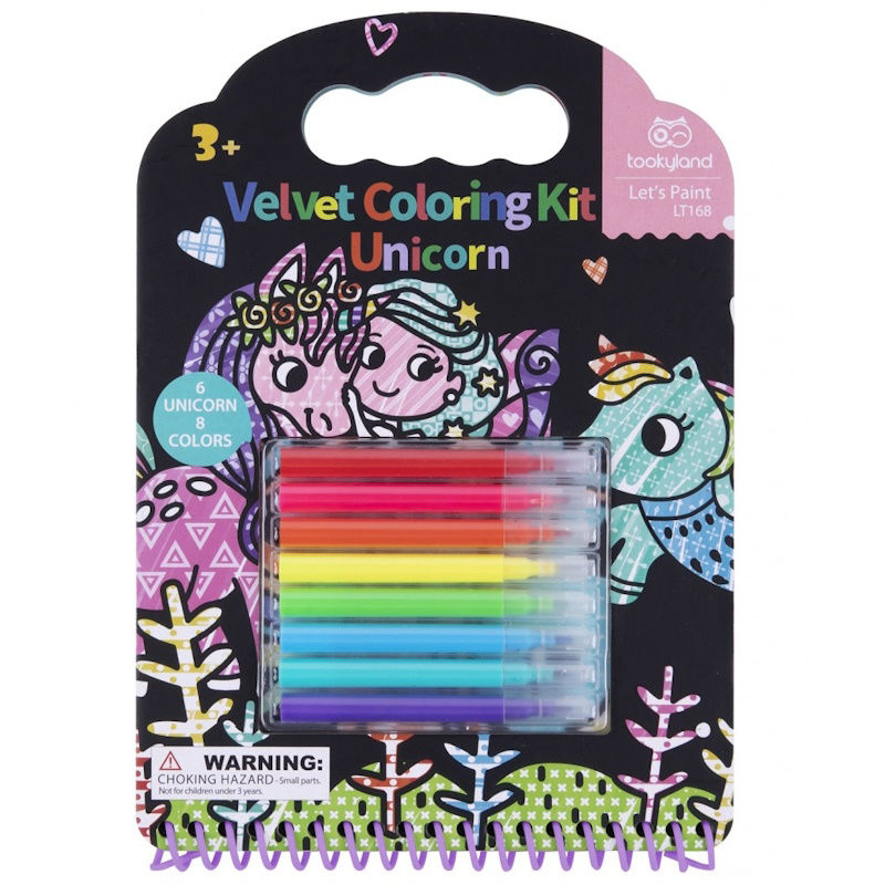 Το σετ ζωγραφικής σε βελούδο μονόκεροι θα ενθουσιάσει τους μικρούς καλλιτέχνες! Περιλαμβάνει 6 σελίδες για χρωματισμό με μονόκερους και 8 μαρκαδόρους σε διαφορετικά χρώματα. Οι σελίδες του σετ έχουν τρύπες στο πάνω μέρος τους, ώστε να μπορούν να κοπούν εύκολα. Έχουν βελούδινη υφή και όταν χρωματιστούν αποκαλύπτονται σχέδια ως δια μαγείας. Το σετ ζωγραφικής διαθέτει λαβή στο πάνω μέρος, έτσι ώστε να είναι εύκολο στη μεταφορά.