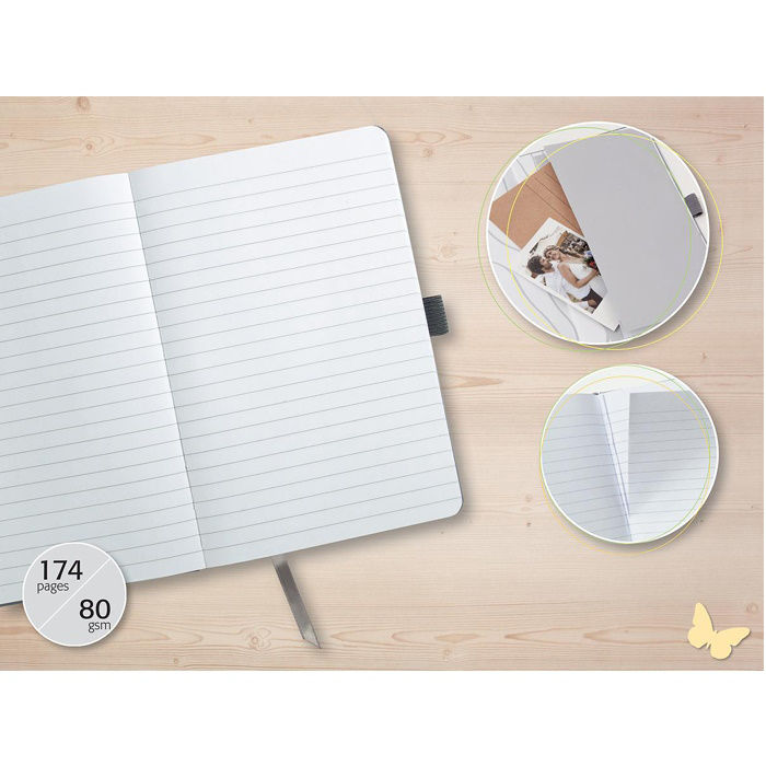 Νότες όμορφα συσκευασμένες και πάντα διαθέσιμες - με το μοντέρνο σημειωματάριο Jolie, με επένδυση σε σχήμα περίπου Α6 (90 x 150 x 6cm) με 174 σελίδες (16 φύλλα από τα οποία είναι διάτρητα). Το στιβαρό σκληρό εξώφυλλο εγγυάται σταθερότητα κατά τη γραφή