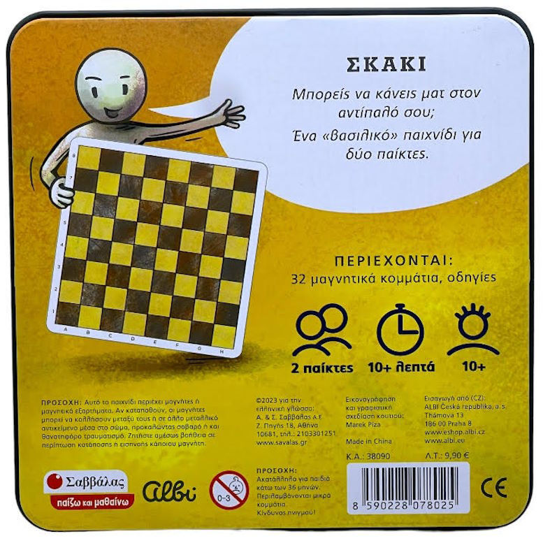 Το μαγνητικό σκάκι ταξιδιού Παίζω και Μαθαίνω είναι η ιδανική λύση για μικρούς και μεγάλους λάτρεις της στρατηγικής, που θέλουν να απολαμβάνουν το αγαπημένο τους παιχνίδι όπου κι αν βρίσκονται. Διαθέτει μαγνητική επιφάνεια και πιόνια που παραμένουν στη θέση τους, ακόμα και σε μετακινήσεις, καθιστώντας το τέλειο για ταξίδια με αυτοκίνητο, τρένο ή αεροπλάνο.